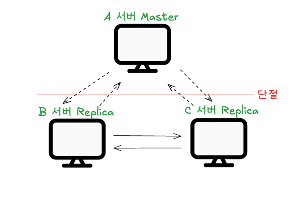 이때 단절된 B, C 노드는 새로운 마스터를 선출하고 데이터를 받을 준비를 합니다.