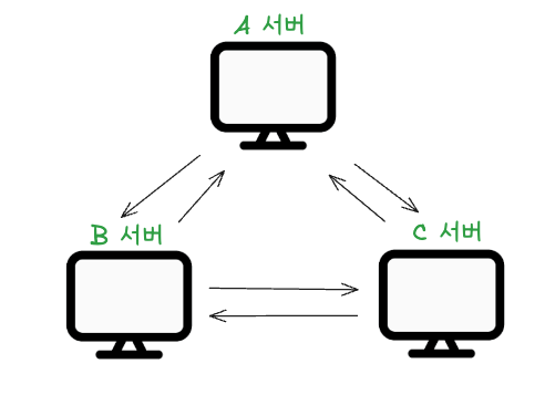 이렇게 3대의 노드가 서로 연결되어 있다고 가정합니다.