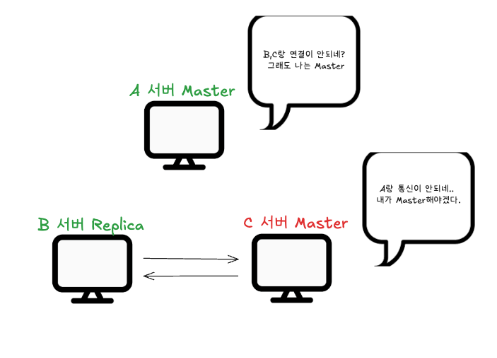 이런 식으로 Master가 2개 생기는 스플릿 브레인 문제가 발생합니다.
